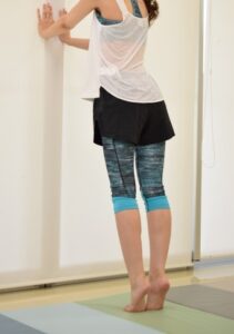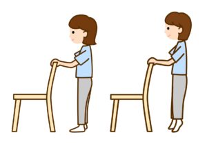 壁や椅子の背もたれに軽く手を添えて立ちます。 ゆっくりかかとを上げてつま先立ちになり、2〜3秒キープ。 ゆっくりとかかとを下ろします。 10〜15回 × 2〜3セットを目安に行いましょう。